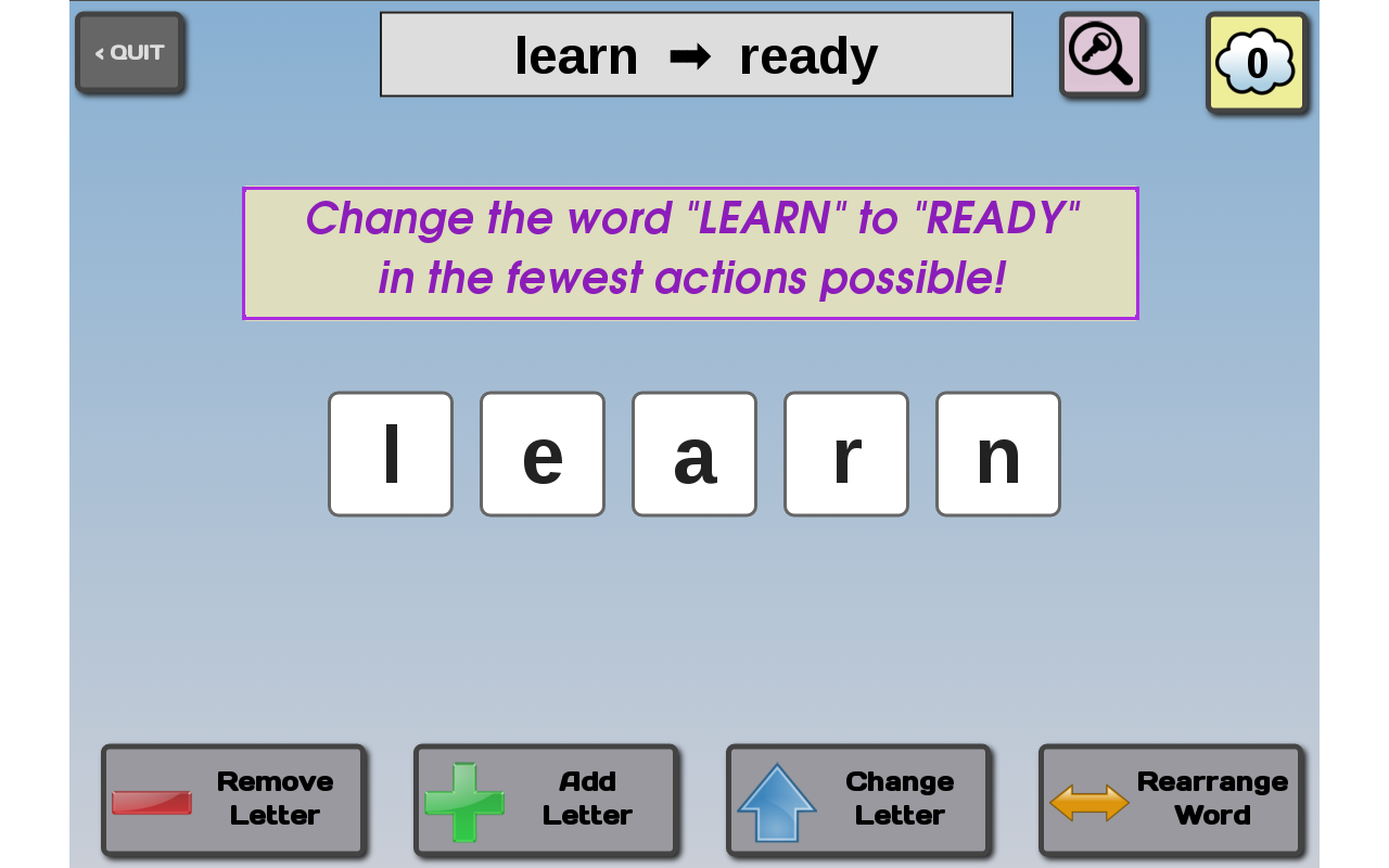 => Your Goal: Change words into other words with the fewest actions possible.