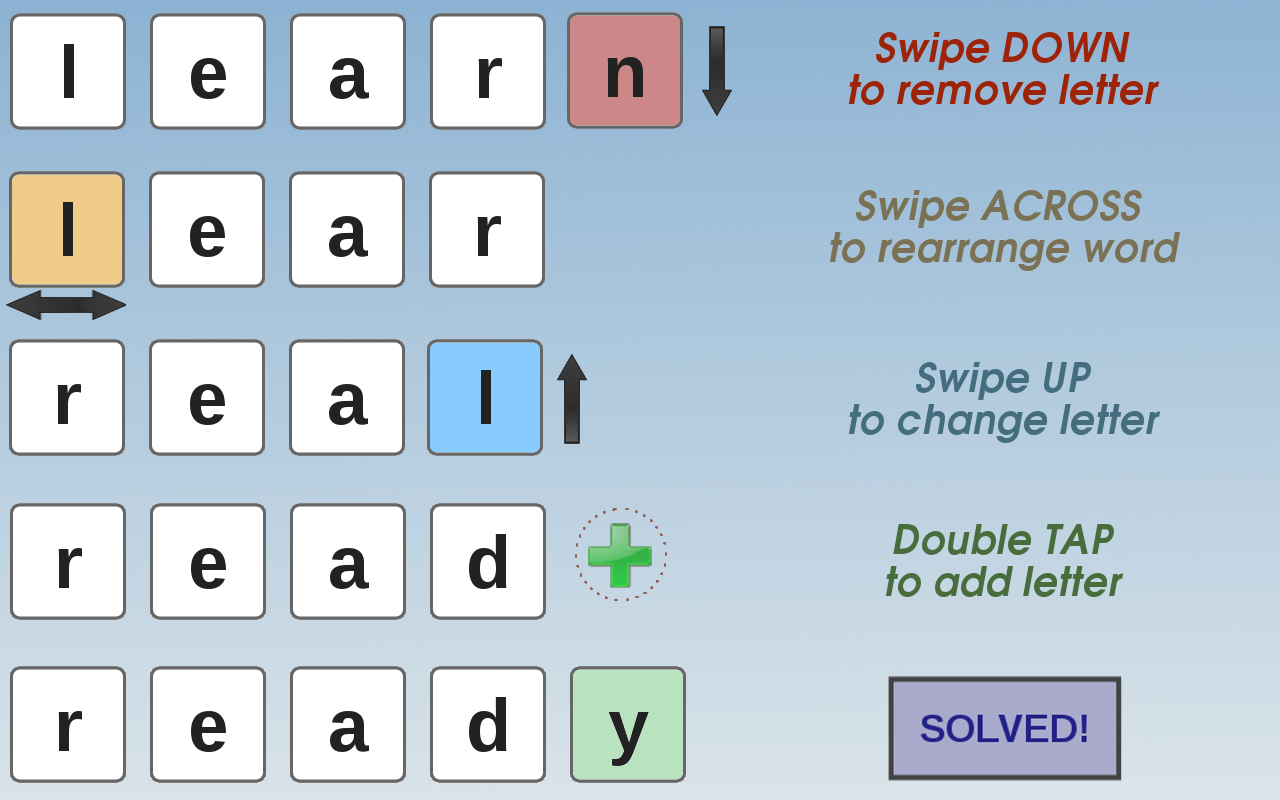 Change words into other words in the fewest actions possible. Dream Words is an easy-to-learn word puzzler where the goal is to change words into other words in the fewest actions possible. With a Puzzle Adventure containing hundreds of hand-picked puzzles, an Arcade Mode to compete for high score on the leaderboard, and a Practice Mode for infinite play, this game provides endless fun for players of all ages!